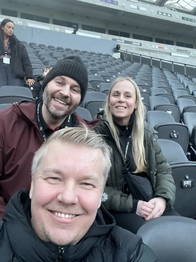 Hópurinn fékk að sitja öll saman í stúkunni þar sem íslenski fáninn sást vel. Stuðningurinn var öflugur og hópurinn naut leiksins og upplifuninar þrátt fyrir úrslitin, en leikurinn tapaðist.