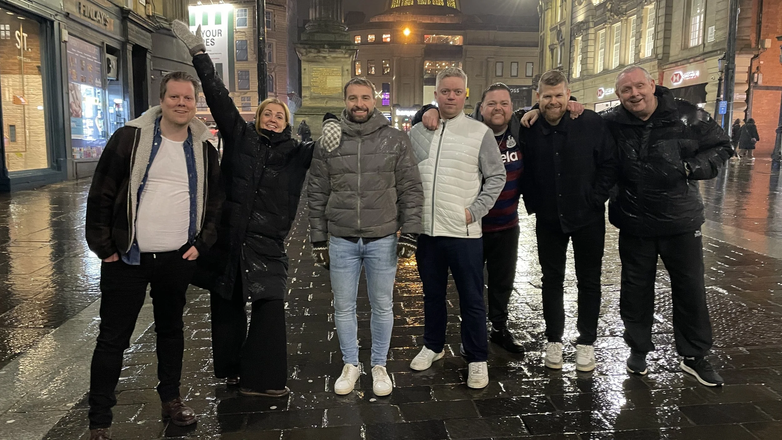 Hluti hópsins á Harry’s við komuna til Newcastle.